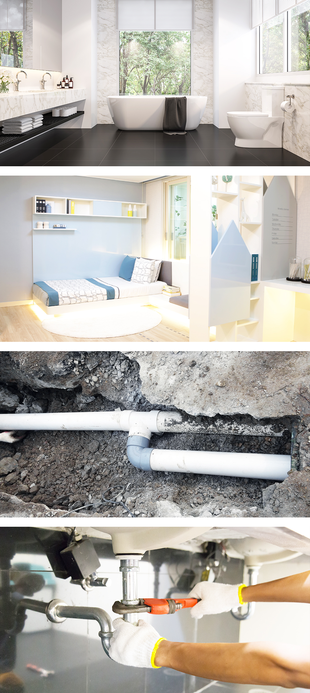 영업안내 · 화장실 리모델링 · 철거 · 집수리 인테리어 · 누수탐지 · 하수구전문 · 고압세척 · 하수구, 변기 뚫음 · 해빙 작업 · 옥상방수, 우레탄방수 · 각종 설비(수도작업) 고객과의 약속 01 고객을 최우선으로 생각합니다. 02 믿음과 신용을 지키기위해 노력하겠습니다. 03 작은 일에도 정성을 다하여 성심껏 모시겠습니다. 04 전화 상담 및 문의 환영합니다.
