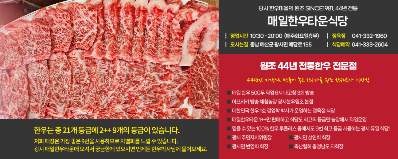 영업안내 · 영업시간 : 10:30 - 20:00 (매주화요일휴무) · 오시는길 : 충남 예산군 광시면 예당로 155 · 정육점 : 041-332-196. · 식당예약 : 041-333-2604 식당프로필 01 매일 한우 500두 직영 6시 내고향 3회 방송 02 아프리카 방송 체험농장 광시한우원조 본점 03 대한민국 한우 1호 경영학 박사가 운영하는 정육점 식당 04 매일한우타운 1++만 판매하고 식당도 최고의 등급만 농장에서 직영운영 05 믿을 수 있는 100% 한우 투플러스 중에서도 9번 최고 등급 사용하는 광시 유일 식당! 06 광시 주민자치위원장 07 광시면 상인회 회장 08 광시면 번영회 회장 09 축산협회 충청남도 지회장 광시의 유례 · 1981년에 타지에서 고향으로 돌아왔을 때, 광시는 광산촌으로 수소를 주로 판매하는 정육점이 세 곳 있었고, 당시 정육점 사장님들은 모두 돌아가셨습니다.