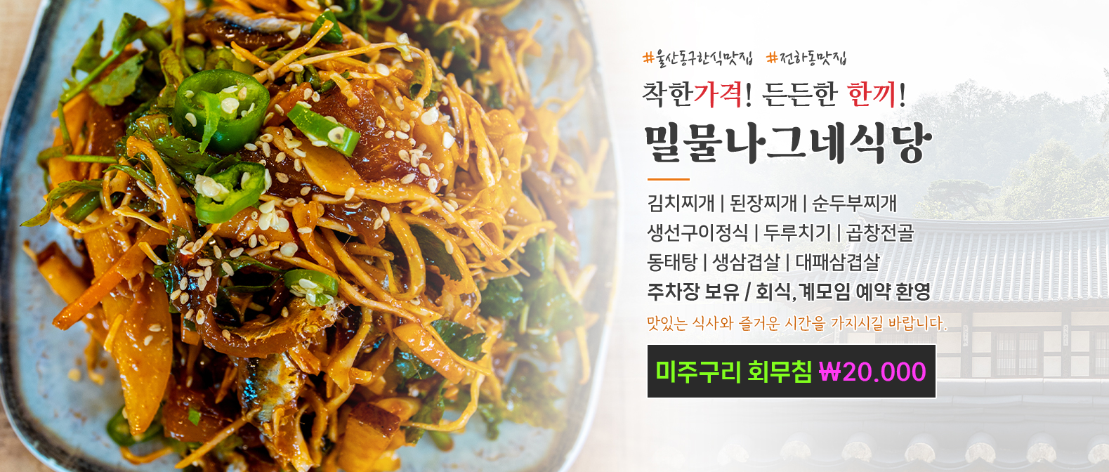 엄선된 식재료로 정성을 다해 조리하여 최상의 맛을 제공해드리고 있습니다. 엄선된 식재료로 정성을 다해 조리하여 최상의 맛을 제공해드리고 있습니다. 성원에 감사드리며 한결같은 맛과 서비스로 보답하겠습니다. 성원에 감사드리며 한결같은 맛과 서비스로 보답하겠습니다. ![]() 메뉴안내 ※ 모든 메뉴 포장 가능 ![]() 고객과의 약속 01. 고객만족, 서비스 만족에 최선을 다합니다. 02. 전화 문의 및 예약 환영합니다. 03. 단체석 완비, 가족 모임, 회식 환영합니다. |