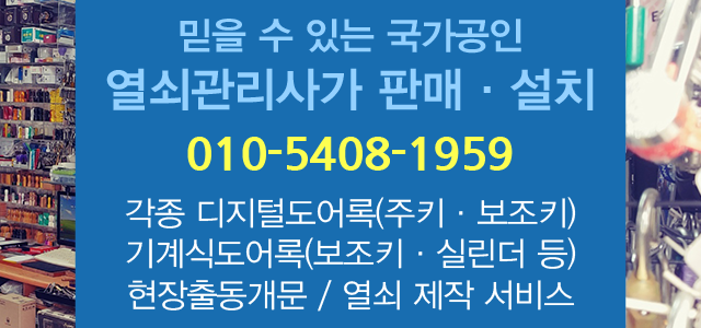 · 디지털 도어록 열쇠 · 디지털도어락 설치 및 수리 도장 · 인감도장 / 법인도장 제작 · 만년인 / 자동도장 · 당일 제작 가능 CCTV · 가정용 / 상업용 CCTV 설치 · 유지보수 및 A/S · 원격 모니터링 세팅 금고 기술교육 · 금고 판매 및 설치 · 실전 위주의 기술교육 디지털도어록 · 주도어록(핸들 일체형) 보조키도어록 · 방화문용 · 샷시문용 · 강화유리문용 기계식 도어록 · 현관 · 신린더방관 · 신린더대문개폐기 인터폰 / 비디오폰 기타 열쇠관련용품 금고 도장
