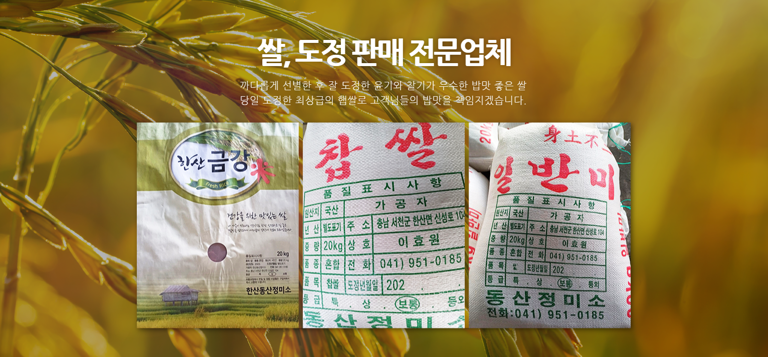 세분화된 도정기술로 정성을 다해 최상의 쌀을 제공드립니다. 성원에 감사드리며 한결같은 쌀맛과 서비스로 보답하겠습니다. 성원에 감사드리며 한결같은 쌀맛과 서비스로 보답하겠습니다. ![]() 정미소안내 · 백미 · 현미 · 흑미 · 잡곡 · 찹쌀 · 햅쌀 · 쌀도정 고객과의 약속 01 전화 문의 환영. 02 전국 택배 환영. 03 고객만족, 서비스 만족. 04 전화 상담 및 문의 환영합니다.