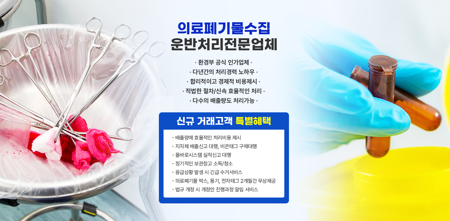 • 환경부 공식 인가업체 병원, 클리닉, 연구소 등에서 발생하는 의료폐기물을 안전하고 효율적으로 수집하고 운반하는 서비스를 제공합니다.