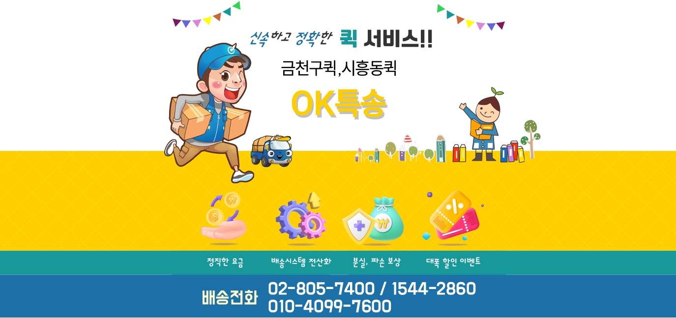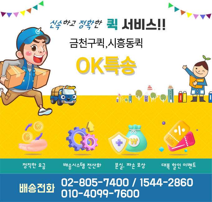 신속하고 정확하게! 퀵배송전문 항상 고객님들께 만족을 드릴 수 있도록 최선의 노력을 다하겠습니다. 후회없는 선택이 되도록 고객 여러분께 다가갈 것을 약속드립니다. 서비스 지역 서울, 금천구, 시흥동 서비스 종류 퀵서비스: 오토바이, 다마스, 라보, 서류배송 서비스 특징 1. 정직한 요금: 거리별 차등 적용 2. 배송시스템 전산화: 안전하고 정확하며 신속한 배송 3. 분실, 파손: 24시간 내 보상 4. 세금계산서, 신용거래 가능 5. 일정 물량 이상 대폭 할인 "이럴 때 퀵서비스를 불러주세요" 1. 약속 시간 내에 전달하기 어려울 때 2. 지정된 시간에 꼭 배달해야 할 때 3. 정기적으로 배송할 물건이 있는 경우 4. 여러 곳으로 분산해서 일정 시간 내에 배송물을 보내야 할 경우 서비스 대상 품목 안내 1. 회사의 긴급 중요 서류, 소형물건, 각종 자료 배달 2. 기업체 필요한 모니터용 신문, 원고, 각종 서류 3. 관공서, 건축 설계 현장에서 요구하는 도면, 사진, 각종 서류 4. 기업 및 가정에 전달할 거래처 선물 5. 꽃배달 등 퀵서비스 특송 이용 제한 대상 1. 변질 및 부패성 화물 2. 화약류, 총포류 3. 생동물 및 사체 4. 고가 화물, 미술품, 골동품 5. 값비싼 귀금속류, 현금, 수표, 어음 6. 깨지기 쉬운 유리제품 7. 생크림이나 액체로 담긴 물건 고객과의 약속 고객을 최우선으로 생각합니다. 믿음과 신용을 지키기 위해 노력하겠습니다. 전화 상담 및 문의 환영합니다.
