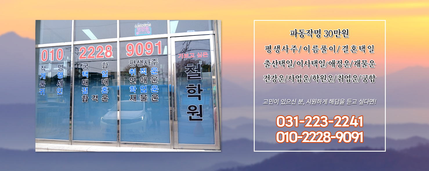 고객만족을 위해 늘 최선을 다하겠습니다. 친절한 상담! 최고의 서비스! 친절한 상담! 최고의 서비스! ![]() 가격표 · 파동작명 : 30만원 · 평생사주 : 1인-3만원, 부부-5만원 · 이름풀이 : 5만원 · 결혼택일 : 10만원 · 출산택일 : 10만원 · 이사택일 : 3만원 · 재물운/애정운/건강운 · 사업운/결혼운/학업운 · 취업운/이동운/궁합 고객과의 약속 01 고객을 최우선으로 생각합니다. 02 믿음과 신용을 지키기위해 노력하겠습니다. 03 작은 일에도 정성을 다하여 성심껏 모시겠습니다. 04 전화 상담 및 문의 환영합니다.