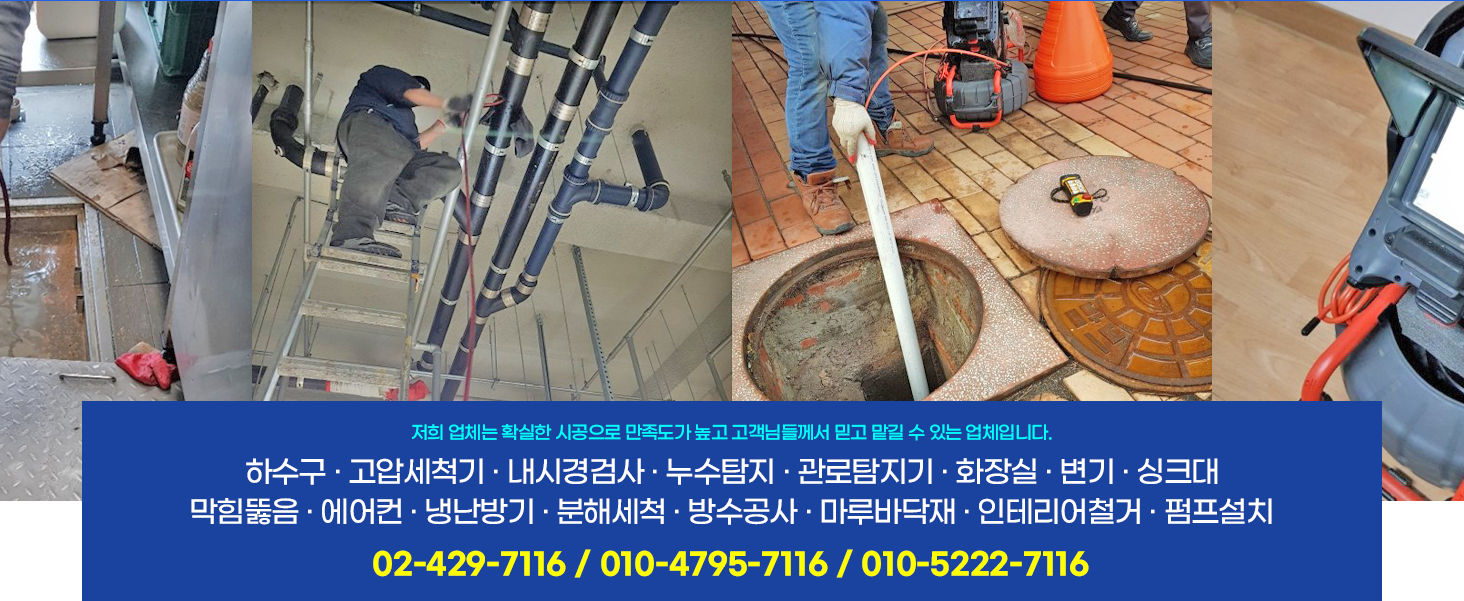 · 하수구 설비는 건물에서 사용되고 나온 오수를 외부(정화조 혹은 시관로배관)로 통수 시켜주고 깨끗한 수돗물을 공급하고 더러워진 오수를 배수시켜주는 공사입니다. · 집안의 방과 거실 또는 욕실 등에 미세하게 크릭이나 결로에 의한 습기나 물이 보였을 때 난방관과 온수관 냉수관의 크릭과 결로로 인한 누수를 청음식과 가스식으로 탐지하여 찾아내는 공사입니다. · 건물의 내부 혹은 외부에 시공 된 배관 및 밸브 등에서 발생한 누수 부위(누수가 발생한 지점)를 누수 탐지기를 사용하여 탐지하여 최소 지점을 굴착한 후 새로운 배관과 부속으로 수리한 후 원 상태로 마감하는 작업을 말합니다. · 고압 세척기란 적은 양의 물을 수압 펌프를 이용하여 순간적으로 고압의 수압을 토출시킬 수 있는 장비를 말한다. · 하수구 / 화장실 / 배수 횡주관 · 고압세척 / 내시경촬영 / 관로탐지 누수탐지 / 펌프설치 · 하수구 화장실 배관 · 횡주관 배수 오수관 우수관 · 고압세척 내시경 촬영 검사 · 관로탑지 누수탐지공사 · 선택이 아니라 필수 입니다! · 하수구 관리는 건강 관리와 비용 절감을 위한 투자입니다. 에어컨 냉 난방기 분해세척