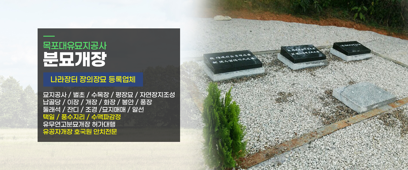 고객만족을 위해 늘 최선을 다하겠습니다. 오랜 경험과 노하우! 친절한 상담! 최고의 서비스! 오랜 경험과 노하우! 친절한 상담! 최고의 서비스! ![]() 사업안내 · 나라장터 장의장묘 등록업체 · 묘지 공사 / 이장 / 매매 / 화장/ 벌초 / 관리 · 유연고 묘, 무연고 묘, 허가 / 공고 / 개장 / 화장 / 봉안 / 안치 · 납골묘, 납골당, 둘래석, 이장 · 잔디 조경, 자연 장지 공사 · 묘지용 토지 파실 분, 사실 분, 작은 평수 · 대유 묘지 공사 / 해암 풍수 · 장례의 모든 것을 신속하게 해 드립니다. · 조상님 산소 벌초 정성껏 해드립니다! · 정성을 다해 내 조상처럼 모시겠습니다. 벌초 대행 이런 분들께 권합니다. · 해외에 계셔서 왕래가 쉽지 않으신 분 · 도심에 거주하시면서 효의 정신을 기리시나 시간과 교통의 불편 혼잡으로 작업이 쉽지 않으신 분 · 남성의 자손이 귀하여 벌초가 여의치 않으신 분 · 기타 여의치 않은 사정으로 불가피한 경우에 있으신 분 고객과의 약속 01 다양한 경험을 바탕으로 고객 만족을 드립니다. 02 믿음과 신용을 바탕으로 처음부터 끝까지 고객과 함께 합니다. 03 꼼꼼한 일처리와 사후관리로 고객만족을 드리겠습니다. 04 양질의 서비스를 제공해 드리겠습니다. 05 고객 만족을 최우선으로 언제나 고객과 함께 하겠습니다. 06 언제든지 전화주시면 친절하게 상담해 드리겠습니다. |