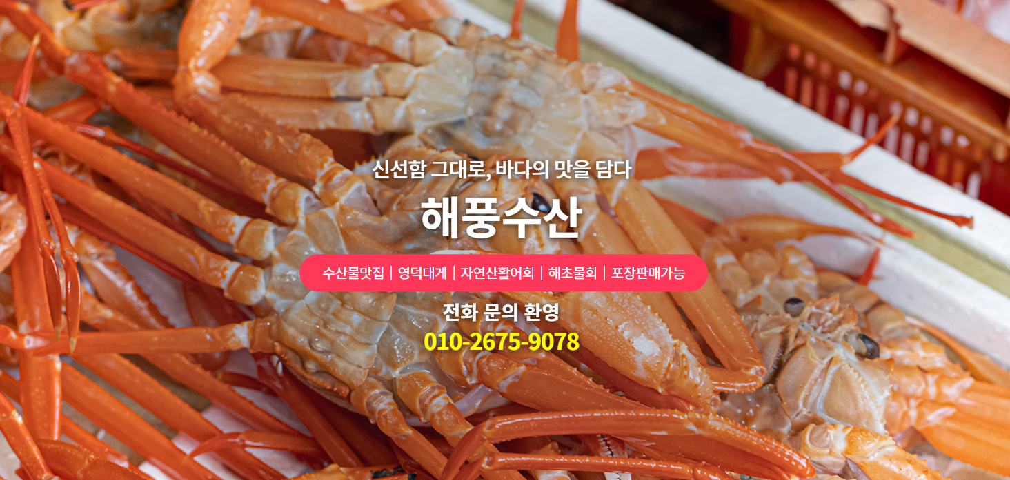 신선한 수산물만을 엄선하여 제공하는 저희 해풍수산은 바다의 풍미를 그대로 느낄 수 있는 수산물 전문점입니다.