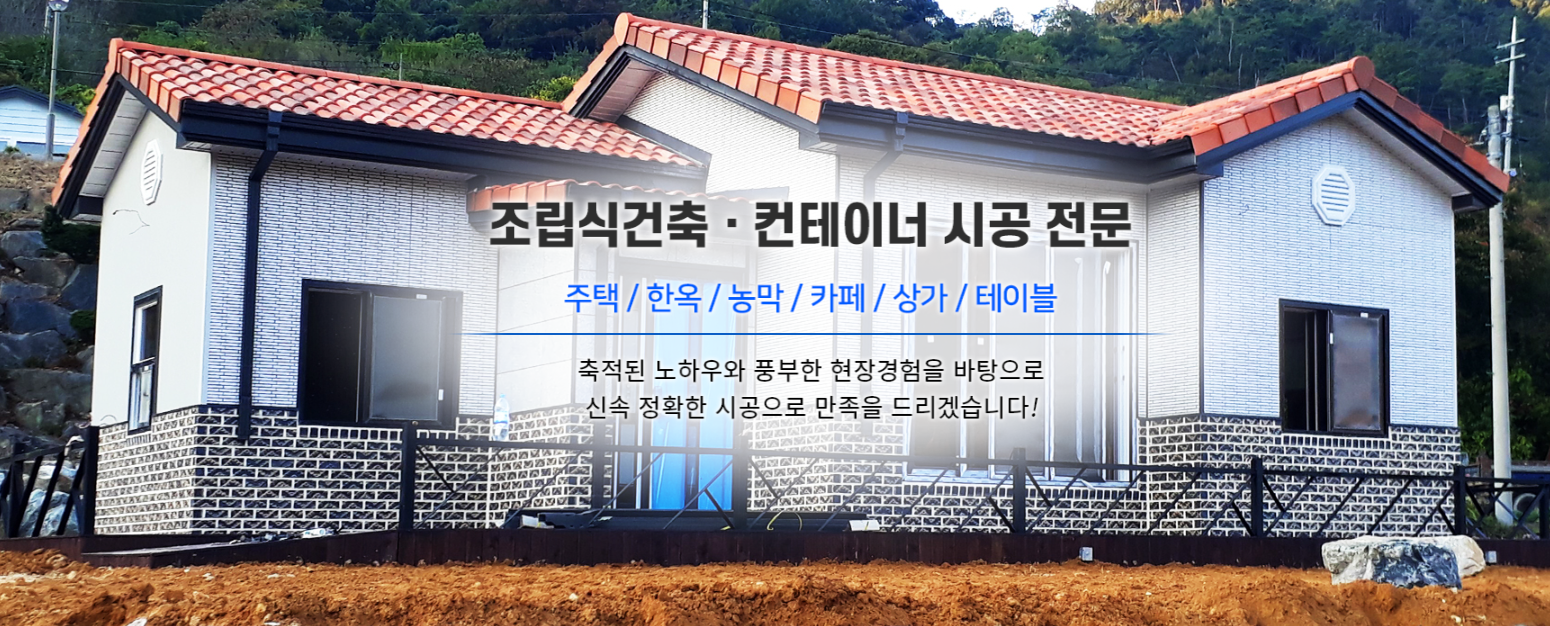 시공분야 · 조립식 주택 · 이동식 주택 (농막) · 전원주택 · 황토주택 · 목조주택 · 에코월 주택 · 컨테이너이동식주택 · 한옥 · 모종 · 테이블 · 카페 · 부스 · 공장건축 영업안내 · 월요일 ~ 금요일 AM 9시 ~ PM 6시 · 토요일 : AM 9시 ~ PM 3시 (일, 공휴일은 예약가능) · email : carmangs@naver.com · 업무 시간 외에는 게시판으로 문의 바랍니다. 고객과의 약속 01 고객을 최우선으로 생각합니다. 02 믿음과 신용을 지키기위해 노력하겠습니다. 03 작은 일에도 정성을 다하여 성심껏 모시겠습니다. 04 전화 상담 및 문의 환영합니다.