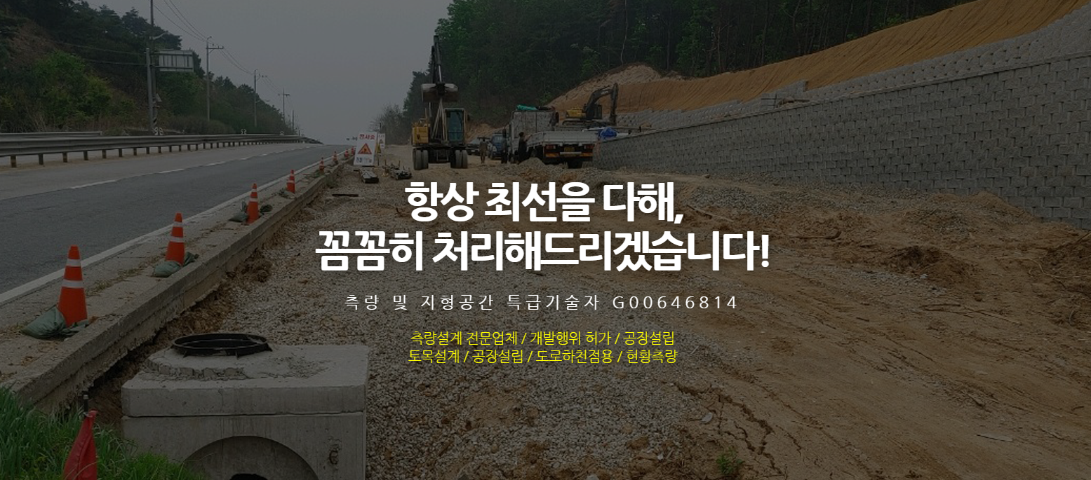만족을 드리도록 항상 최선을 다하겠습니다. 친절, 봉사로써 여러분께 만족을 드리도록 항상 최선을 다하겠습니다. 그동안의 노하우와 기술을 바탕으로 최고의 서비스로 고객님께 최선을 다하겠습니다. 언제나 고객님의 입장에서 만족시켜 드릴 수 있도록 노력하겠습니다. 그동안의 노하우와 기술을 바탕으로 최고의 서비스로 고객님께 최선을 다하겠습니다. 언제나 고객님의 입장에서 만족시켜 드릴 수 있도록 노력하겠습니다. ![]() 영업안내 · 측량업, 설계 사무소, 개발행위 허가 · 공장, 농지, 허가 상담환영 · 측량인 허가 전문대행 상세정보 · 산지전용 개발행위 인.허가, 형질변경 전문, 각종 측량 · 민원상담, 전화문의 및 상담 환영 · 현황측량, 형질변경, 각종 신고 및 인.허가 측량설계 전문 · 농지전용, 산림형질 변경 · 공장설립, 토목설계 · 국토이용 계획변경, 인.허가 상담 허가 농지전용 허가 ![]() · 공장사업 계획승인 개간사업시행인가 · 도로(하천)점용허가 · 개발행위 허가 도시관리 계획 · 학교시설 사업실시 계획인가 · 공작물 설치허가 기타 인허가 · 관련업무 묘지설치 허가 저희 업체는 ※ 전문성이 요구되고 (예시 : 측량, 투자수요및 이익창출) 전체적인 흐름 (예시 : 주택의 경우 입주시까지 제 문제 등 해결)에 따른 해당관청의 요구해결과 의뢰자의 욕구충족성이 요하는 업무로써 대행성이 강한 업무입니다. ※ 농지에 주택이 필요할시 관련법 검토 ,현장측량및 인.허가 서류작성 제출 허가를 득한 후 취향에 맞게 건축사 건축설계의뢰 (별도로) 지적련사에 경계측량 후 시공업자 선정시공, 준공전 정화조 상,하수도 깨스,전기공급 등에 따른 관련조건이행 후 입주 여기에 도로, 또랑있으면 별도검토 해결 후 진행으로 단순히 거주목적도 현행법상 엄청 복잡합니다. 팬션, 다중이용시설, 공장, 묘지 등도 위와 같은 진행절차에 따릅니다. 다만, 적용법령과 사전검토사항이 많다 뿐입니다만 이는 전적으로 상호간 이해와 신뢰로 만이 이 많은 제 문제점을 해결할수 있습니다. 감사합니다. ![]() 측량이란 그러나 측량에는 많은업종이 있읍니다. 저희는 행정관청을 상대로 인,허가를 위한 대행업체입니다.
