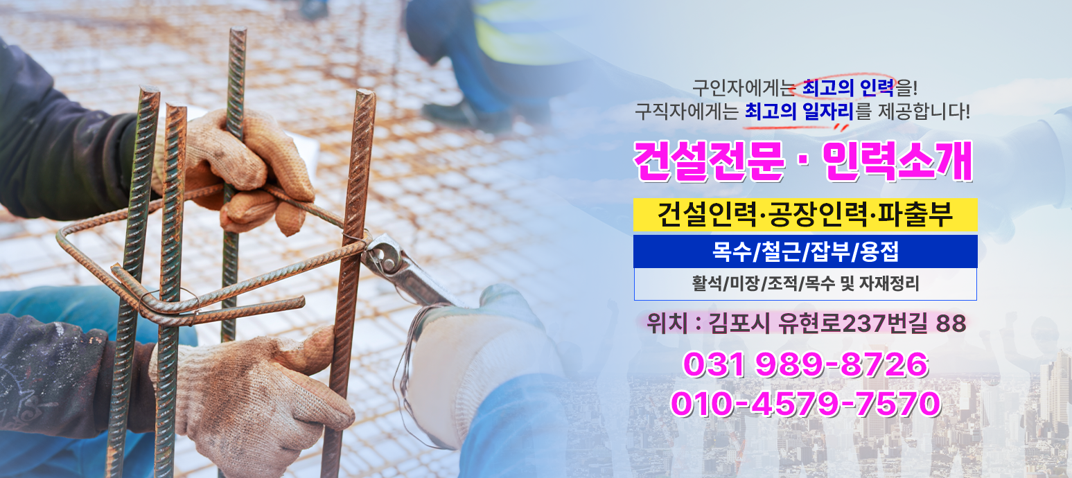 철거용역, 건설인력, 공장인력, 농촌인력, 바다작업, 청소인력 업무에 필요한 전문 기술과 경험을 갖춘 인력을 제공합니다.