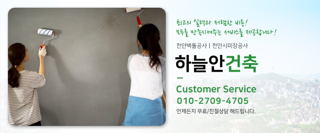 고객만족을 위해 늘 최선을 다하겠습니다. 오랜 경험과 노하우! 친절한 상담! 최고의 서비스! 오랜 경험과 노하우! 친절한 상담! 최고의 서비스! ![]() 영업안내 · 벽돌공사 · 미장공사 · 건축 고객과의 약속 01 다양한 경험을 바탕으로 고객 만족을 드립니다. 02 믿음과 신용을 바탕으로 처음부터 끝까지 고객과 함께 합니다. 03 고객 만족을 최우선으로 언제나 고객과 함께 하겠습니다. 04 언제든지 전화주시면 친절하게 상담해 드리겠습니다. |