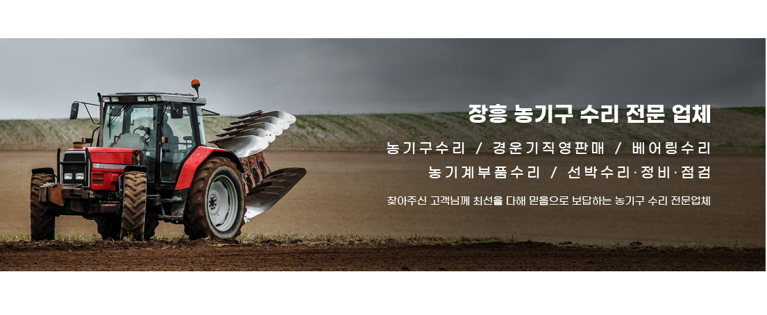 고객만족을 위해 늘 최선을 다하겠습니다. 친절한 상담! 최고의 서비스! 친절한 상담! 최고의 서비스! ![]() 영업안내 · 농기구 수리 · 경운기 직영판매 · 베어링 수리 · 농기계 부품 수리 · 각종 선박 수리 및 점검·정비 · 꼼꼼한 정비 기술력 · 최고의 품질 / 신속한 수리 고객과의 약속 01 고객을 최우선으로 생각합니다. 02 믿음과 신용을 지키기위해 노력하겠습니다. 03 작은 일에도 정성을 다하여 성심껏 모시겠습니다. 04 전화 상담 및 문의 환영합니다.