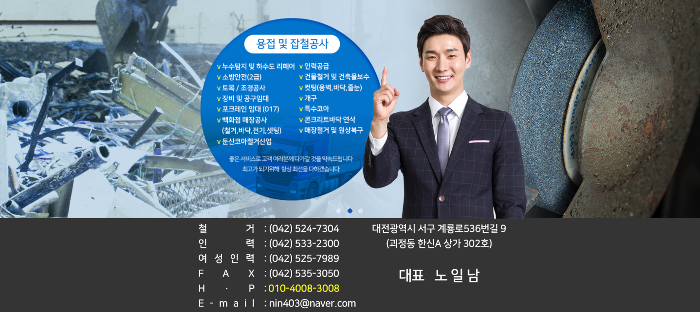 고객만족을 위해 늘 최선을 다하겠습니다. 오랜 경험과 노하우! 친절한 상담! 최고의 서비스! 오랜 경험과 노하우! 친절한 상담! 최고의 서비스! ![]() 영업안내 · 누수탐지 및 하수도 리페어 · 용접 및 잡철공사 · 인력공급 · 건물철거 및 건축물보수 · 컷팅(옹벽,바닥,줄눈) · 개구 · 특수코아 · 콘크리트바닥 연삭 · 장비 및 공구임대 · 포크레인 임대 · 매장철거 및 원상복구 · 백화점 매장공사(철거,바닥,전기,셋팅) · 강마루및데코타일철거 고객과의 약속 01 고객을 최우선으로 생각합니다. 02 믿음과 신용을 지키기위해 노력하겠습니다. 03 작은 일에도 정성을 다하여 성심껏 모시겠습니다. 04 전화 상담 및 문의 환영합니다.