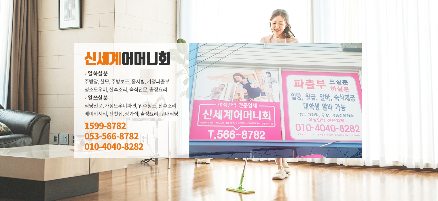고객만족을 위해 늘 최선을 다하겠습니다. 친절한 상담! 최고의 서비스! 친절한 상담! 최고의 서비스! ![]() 일 하실 분 · 주방장 · 찬모 · 주방보조 · 홀서빙 · 가정파출부 · 청소도우미 · 산후조리 · 숙식전문 · 출장요리 일 쓰실 분 · 식당전문 · 가정도우미파견 · 입주청소 · 산후조리 · 베이비시티 · 잔칫집 · 상가집 · 출장요리 · 구내식당 고객과의 약속 01 고객을 최우선으로 생각합니다. 02 믿음과 신용을 지키기위해 노력하겠습니다. 03 작은 일에도 정성을 다하여 성심껏 모시겠습니다. 04 전화 상담 및 문의 환영합니다.
