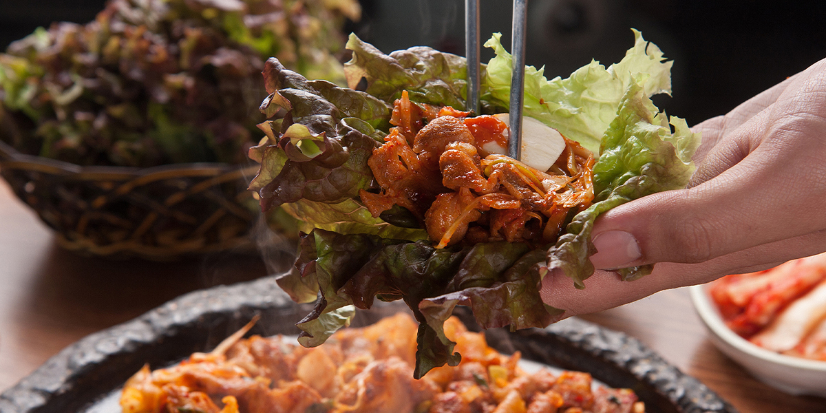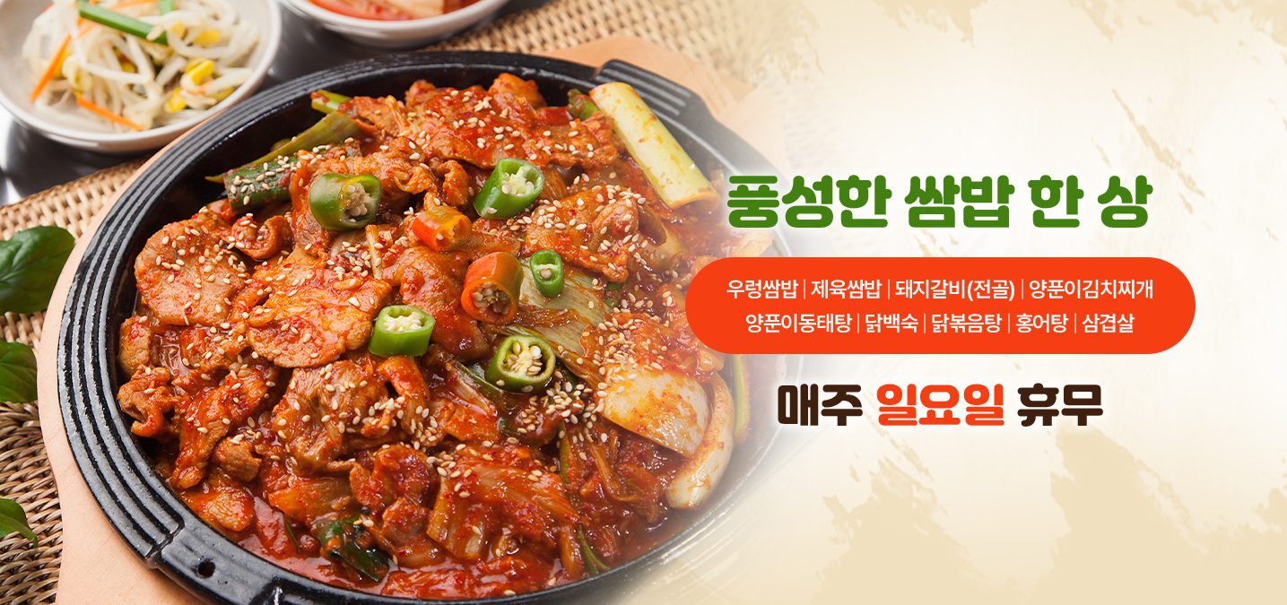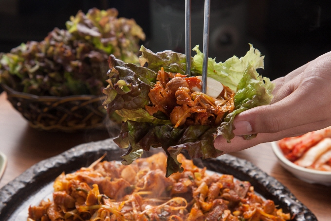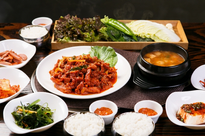 매콤하게 볶아낸 제육과 따뜻한 밥을 쌈에 싸 먹는 든든하고 만족도 높은 한 상입니다.