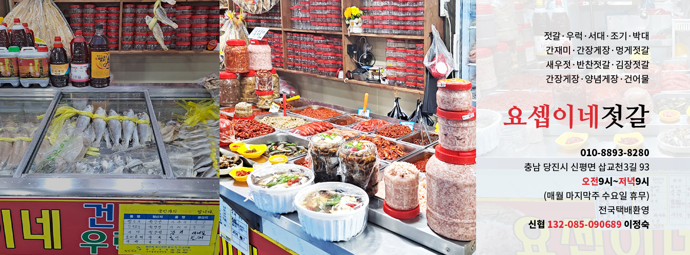 · 젓갈 · 우럭 · 서대 · 조기 · 박대 · 간재미 · 간장게장 · 멍게젓갈 · 새우젓 · 반찬젓갈 · 김장젓갈 · 간장게장 · 양념게장 · 건어물 · 전국택배가능 · 주소|충남 당진시 신평면 삽교천3길 93 · 연락처|010-8893-8280 · 업무시간|오전9시~저녁9시 (매월 마지막주 수요일 휴무) 전국택배환영 · 계좌번호|신협 132-085-090689 이정숙 고객과의 약속 01 고객을 최우선으로 생각합니다. 02 믿음과 신용을 지키기위해 노력하겠습니다. 03 작은 일에도 정성을 다하여 성심껏 모시겠습니다. 04 전화 상담 및 문의 환영합니다.