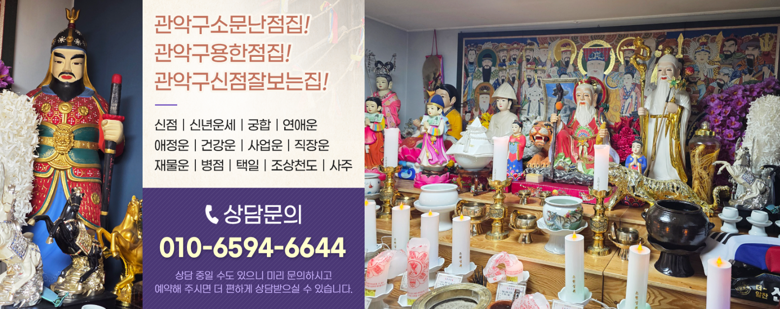 01. 신년운세새해 운세 흐름 상담 02. 재물운사업·금전 흐름 개선 상담 03. 부동산운매매·임대 문제 해결 상담 04. 부부고민갈등·외도 문제 상담 05. 애정운 · 궁합연애·결혼 인연 상담 06. 금전운금전 문제 해결 07. 직장운승진·시험·직장 고민 08. 자녀운자녀 진로 및 문제 상담 09. 액운풀이구설수·액운 제거 10. 병점원인 모를 병 상담 11. 택일이사·개업·결혼 날짜 12. 조상천도천도굿·49재 13. 사주인생 흐름 상담 14. 부적맞춤 부적 처방 15. 신병·퇴마빙의·신병 해결 16. 꿈해몽·관상꿈풀이·관상 상담
