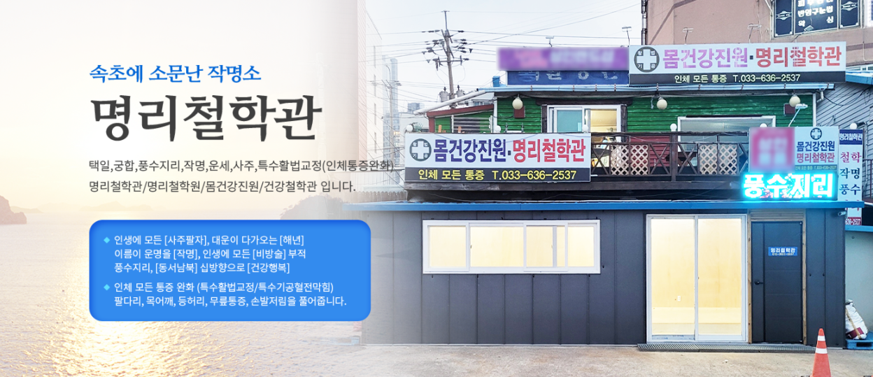 고객만족을 위해 늘 최선을 다하겠습니다. 오랜 경험과 노하우! 친절한 상담! 최고의 서비스! 오랜 경험과 노하우! 친절한 상담! 최고의 서비스! ![]() 상담 안내 · 인생의 모든 사주팔자 · 대운이 다가오는 해년 · 이름이 운명을 작명 · 풍수지리 동서남북+십방향으로 건강행복 · 인체 모든 통증 완화 · 특수활법교정 특수기공(혈전막힘) · 팔 다리 목 어깨 등 허리 무릎 손발저림 · 인생의 모든 비방술 부적 고객과의 약속 01 고객을 최우선으로 생각합니다. 02 믿음과 신용을 지키기위해 노력하겠습니다. 03 작은 일에도 정성을 다하여 성심껏 모시겠습니다. 04 전화 상담 및 문의 환영합니다.